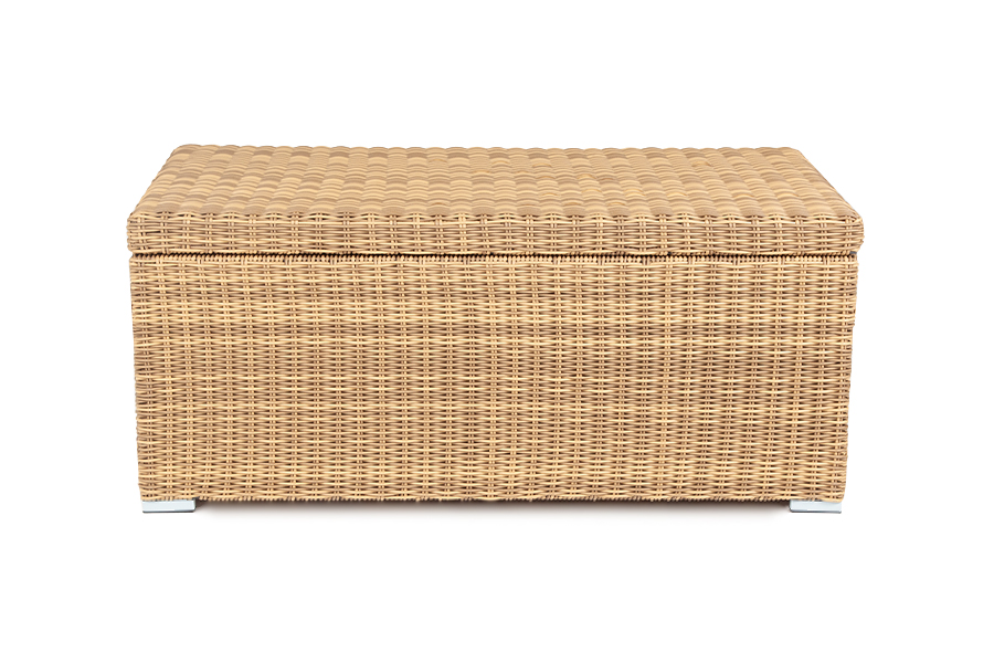 «Порту» вместительный сундук из плоского искусственного ротанга соломенного оттенка. В основе - алюминиевый каркас.