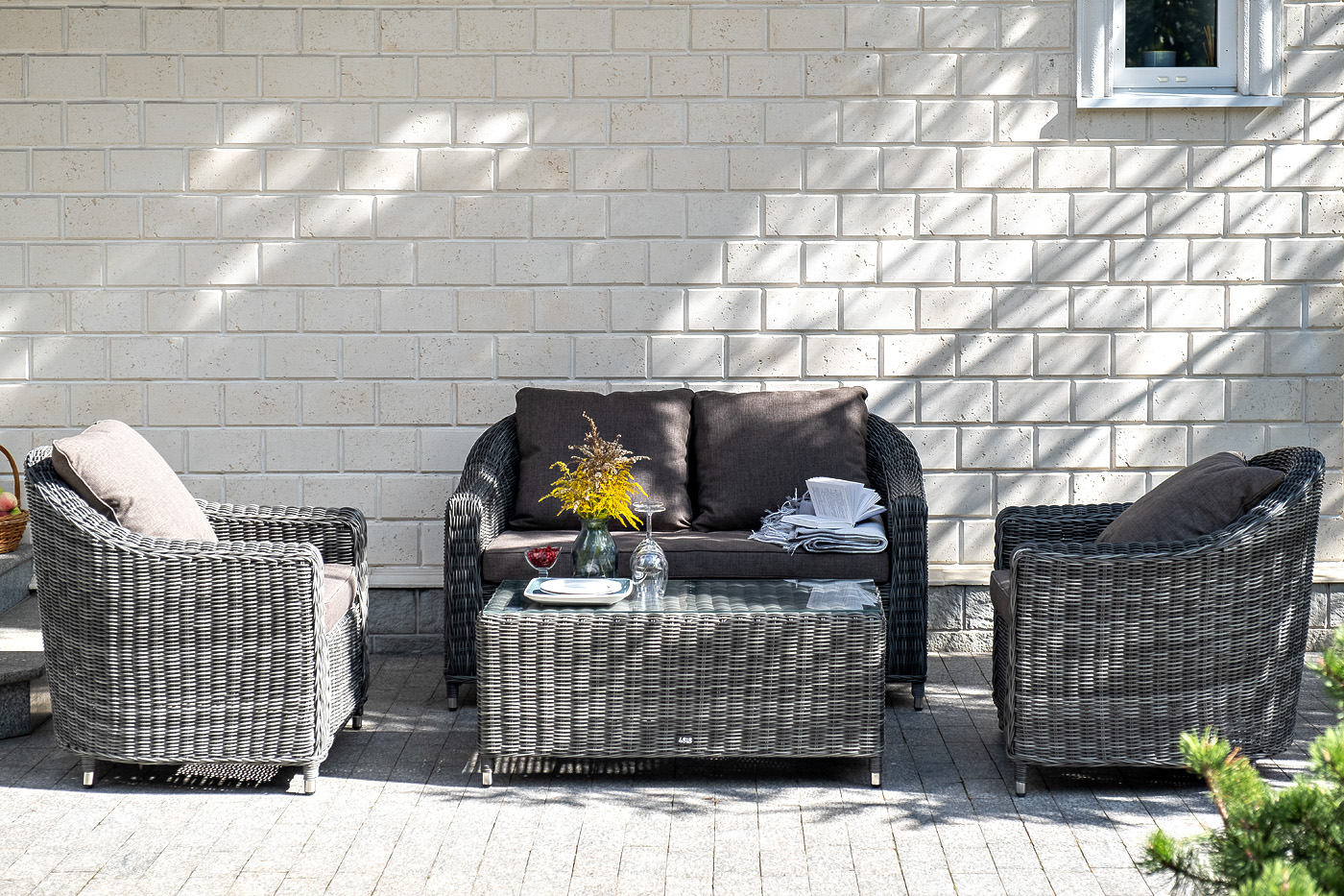 Размер модели – 800×800×800 мм. В качестве основы служит алюминиевый каркас, который оплетен круглым искусственным ротангом графитового оттенка.