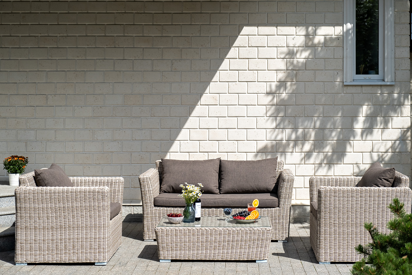 Более комфортной лаунж-зону делают мягкие подушки с чехлами из серо-коричневого полиэстера. Его плотность находится в рамках 230гр/м2. Ткань предварительно обрабатывается влагоотталкивающими составами.
