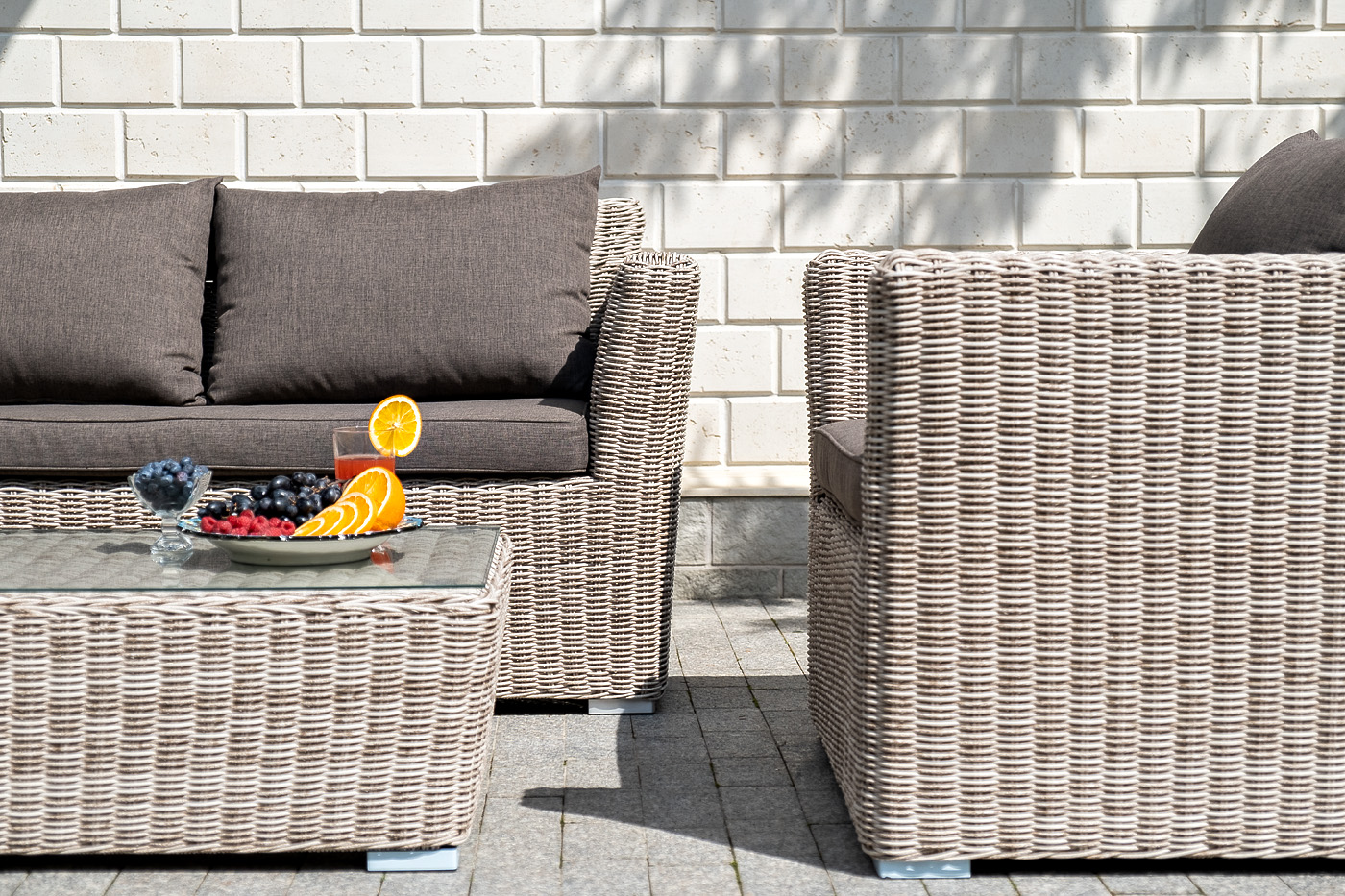 Прочный алюминиевый каркас усиливает устойчивость мебели. Его дополняет бежевая оплетка, которая представлена из круглого искусственного ротанга.