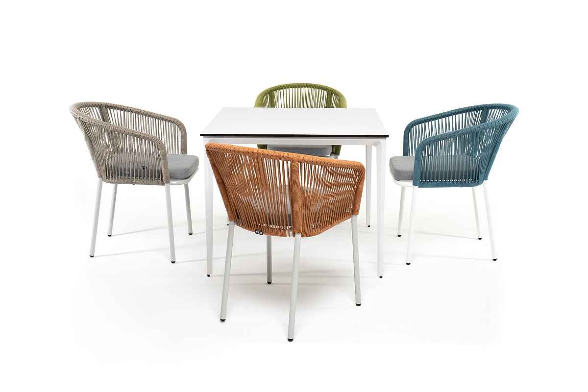 Каркас стульев выполнен из алюминия. Оплетка выполнена вручную современным материалом - роупом. Цвет оплетки - бирюзовый, салатовый меланж, оранжевый меланж и серый меланж. В комплект входят подушки со съёмными водоотталкивающими чехлами светло-серого цвета.